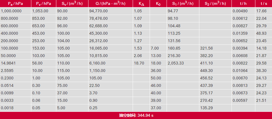 腔體的抽空時間需要根據(jù)不同的階段分別計算得出。在抽速變化強烈的區(qū)域,前級真空壓力間隔配置必須較小。公式2-9用于確定間隔期間的抽空時間,使用S作為計算壓力間 隔階段兩個抽速的平均值??偝榭諘r間將是表 2-1 一列時間之和。